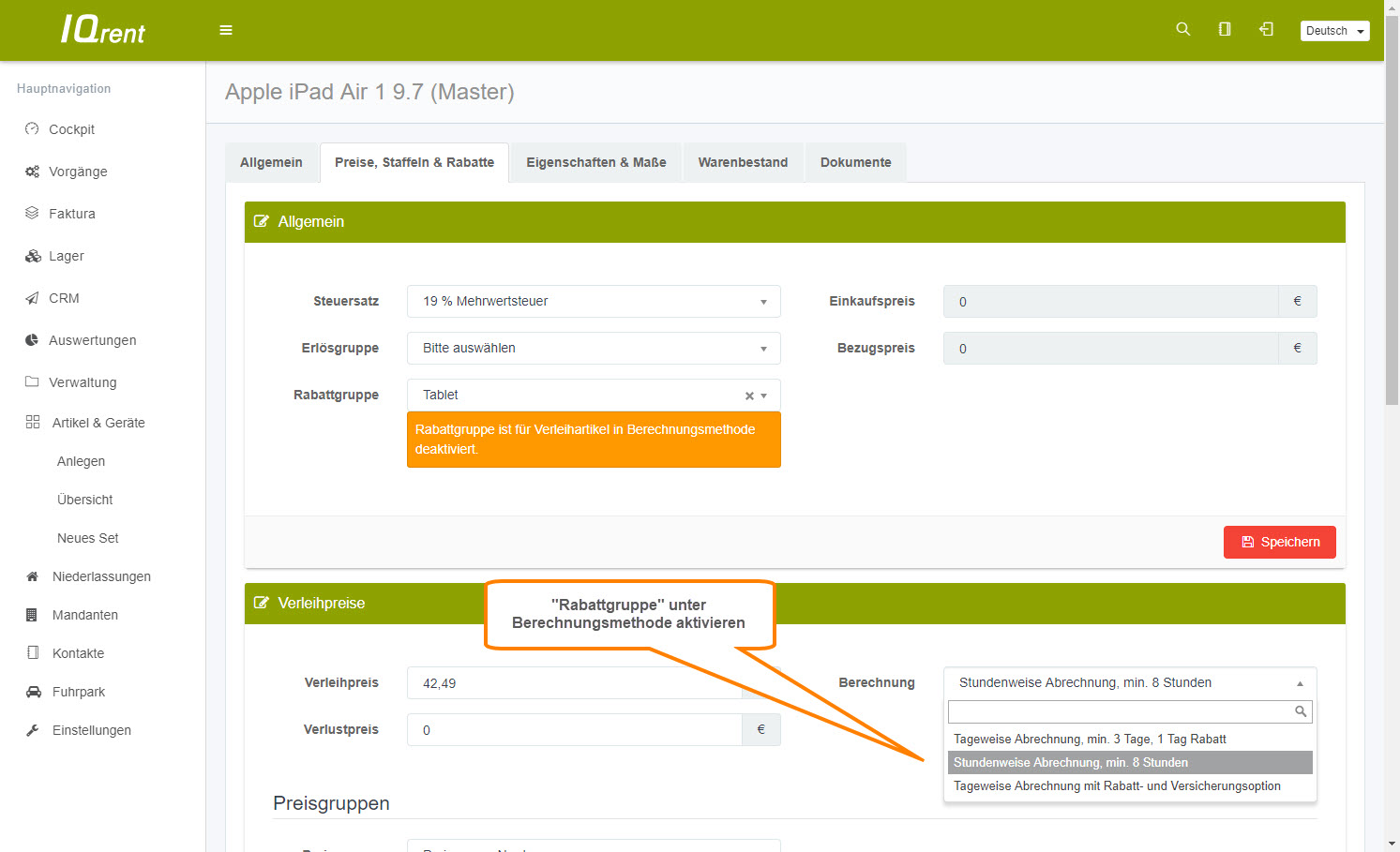 „Rabattgruppe“ muss unter der zugewiesenen Berechnungsmethode aktivieret sein!
